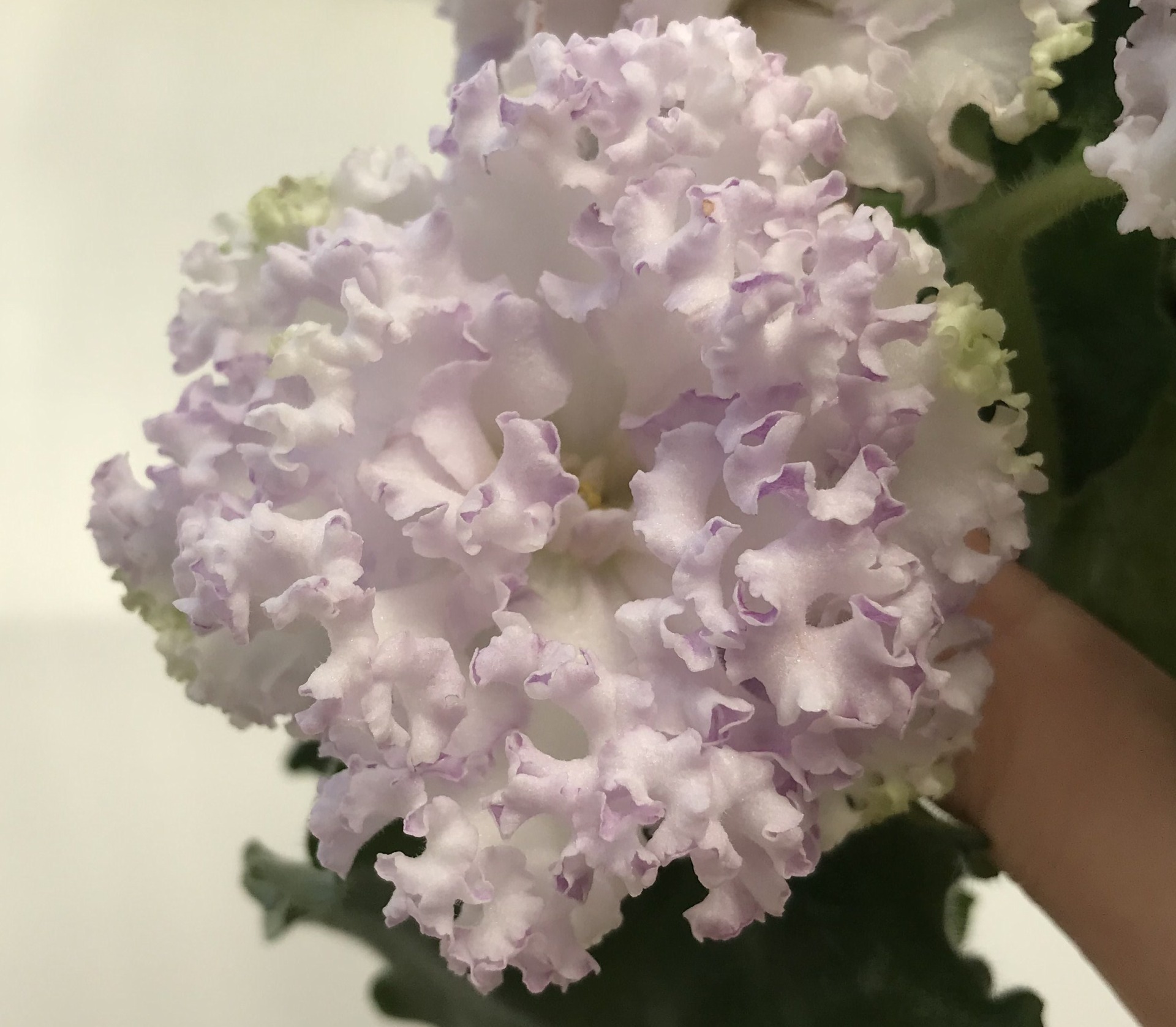 Гофрированные махровые бело-салатовые звезды с розовым глазком. Светло-зеленые слегка волнистые листья. Цвeты долго дeржатся. Огромное пушистое облако покрывает всю розетку!
