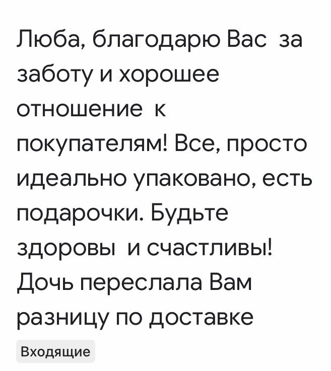 Любочка! Получила посылку, огромное спасибо! Всё дошло прекрасно! Отдельное спасибо за подарочки. Дай Бог вам здоровья за вашу доброту и пусть у вас всё растёт на радость нам!