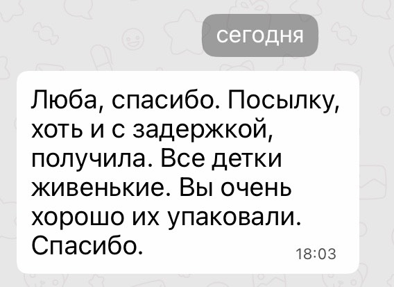 Здравствуйте, Любовь. Сегодня получила посылку. Впервые получаю таких прекрасных деток в такой хорошей упаковке. Большое Вам спасибо! И конечно же благодарю Вас за подарки. Ещё раз благодарю Вас за хорошую работу и надеюсь на дальнейшее сотрудничество.