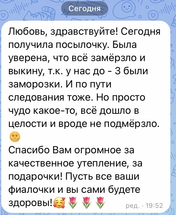Здравствуйте, Любовь! Сегодня получила вашу посылочку. Все фиалочки чувствуют себя очень хорошо. Отдельно, огромное спасибо вам за подарки, они просто роскошные! В будущем буду ещё выписывать у вас, т.к. с вами очень приятно общаться и сотрудничать. Удачи вам в выращивании цветочков, которые своей красотой радуют людей!
