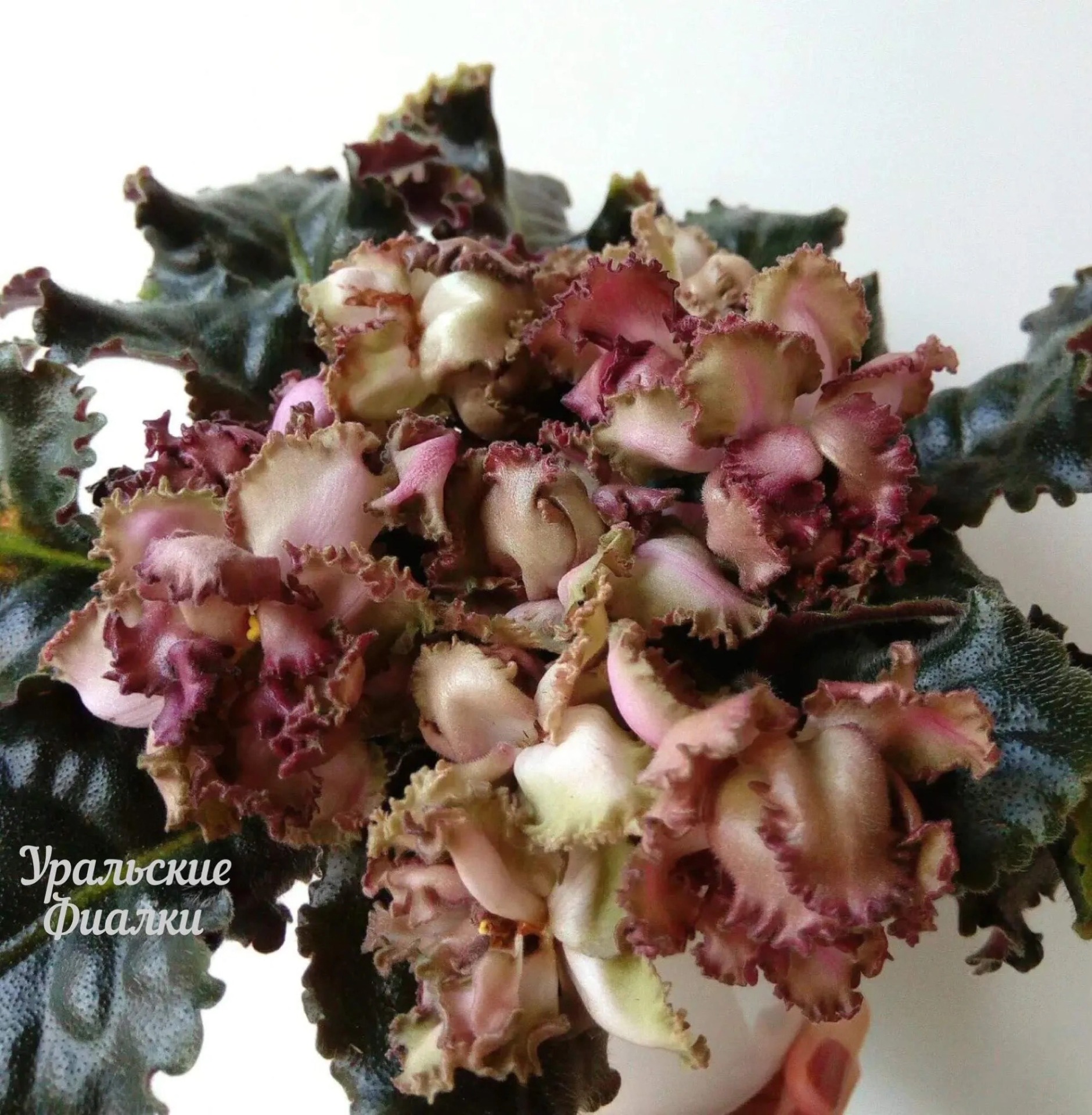 Новинка! Полумахровые и махровые, коричневые цветы с прожилками с широкой зелёно-болотной каймой и коричнево-зелёной бахромкой прекрасны и гармоничны на фоне тёмно-зелёной волнистой листвы.